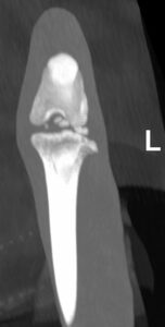 Diagnostics: Odysseus was admitted for CT and joint taps under general anaesthesia. He was sedated with the owner to reduce the stress associated with the procedure. On CT, he had bilateral intra-articular lesions possibly associated with a cranial cruciate ligament disease and historic fractures of his right metatarsals with callus formation. There were some mild osteoarthritic changes in some joints but his spine was normal. Joint taps showed changes that could indicate IMPA but this was not definitive.